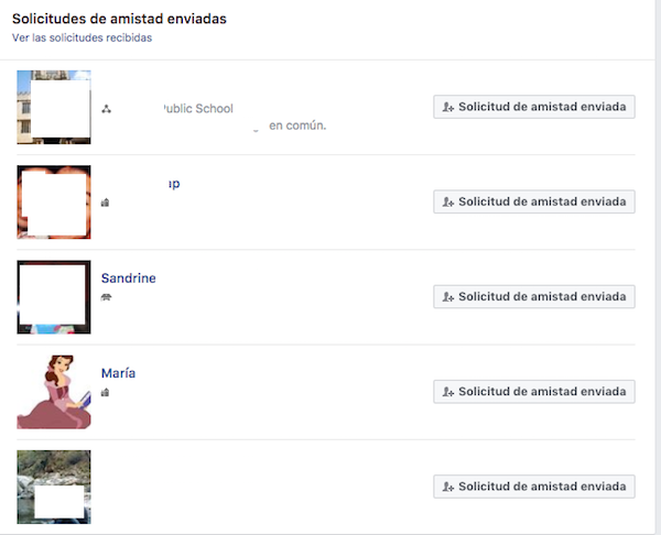 Como ves, en ese mismo cuadro puedes pulsar sobre Ver las solicitudes enviadas y Facebook te mostrará la lista de personas a las que has enviado petición de amistad y que no han aceptado. Aparecerán con el texto “Solicitud de amistad enviada” en el botón de la derecha.